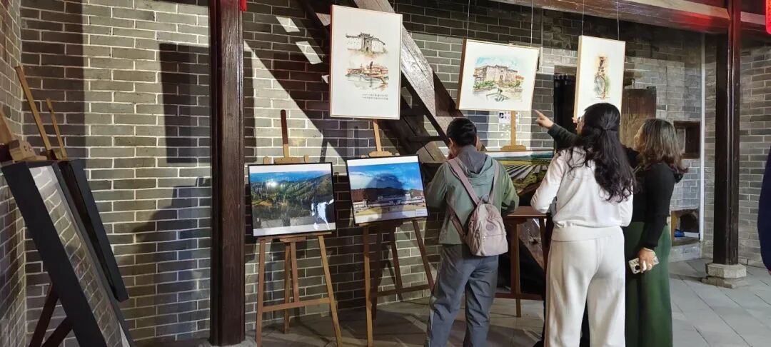 走进现场,书法和水彩等作品引人注目,其中水彩作品以写意手法,斑驳的青砖与院中的古榕、秋日的暖阳融为一体,笔触细腻处可见瓦当纹路,留白处又尽显围楼的开阔意境;书法作品以行书书写客家谚语,笔力遒劲洒脱,墨色浓淡相宜;而摄影作品则记录了少数民族身着五彩刺绣盛载歌载舞。不少游客驻足作品前,讨论着不同民族的服饰与习俗,现场互动氛围热烈。
